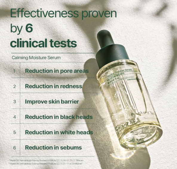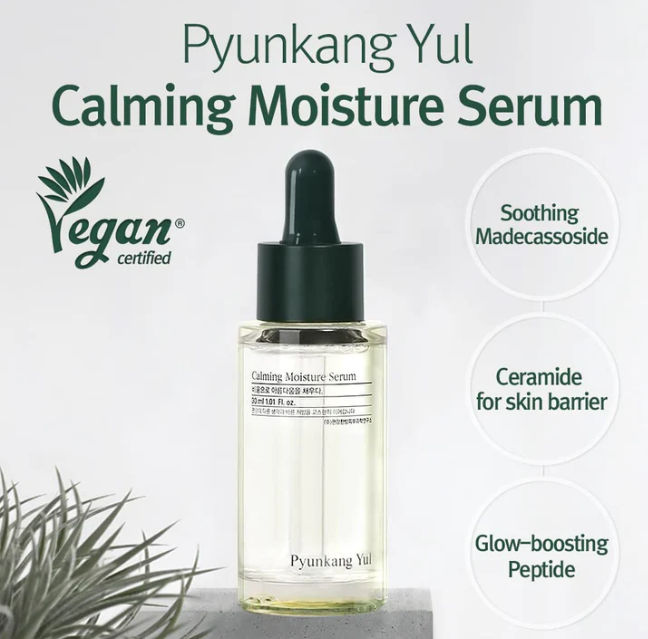 Pyunkang Yul Calming Moisture Serum e oвлажняващ и успокояващ серум, който съдържа 5 вида екстракти от Centella Asiatica, екстракт от чаено дърво и екстракт от орлови нокти за незабавно успокояване на раздразнената кожа и в борбата с лечението на акне и други несъвършенства. Осигурява интензивна хидратация и грижа за кожната бариера, благодарение на серамиди, хиалуронова киселина и пептиди в състава си. Нежната формула има леко кисело pH, което съответства на естественото pH на кожата, което го прави изключително подходящ за всеки тип кожа, включително и много чувстивтелна и раздразнена кожа.