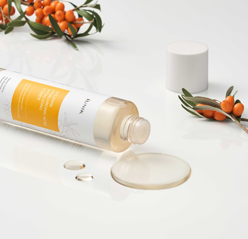 Витаминният тоник за лице с хиалуронова киселина и екстракт от морски зърнастец iUnik Vitamin Hyaluronic Acid Vitalizing Toner попълва липсата на влага в кожата, възстановява оптималното киселинно-алкално ниво, подготвя кожата за последваща грижа и подобрява тена. Тонерът предпазва кожата от дехидратация, изсушаване и опъване. Обилно овлажнява кожата и пренася влагата дълбоко в клетките на епидермиса. Поддържа оптимално ниво на хидратация, а активните компоненти на продукта насищат епидермиса с полезни витамини, повишават имунитета на кожата и имат изразен антиоксидантен ефект. Подобрява цялостното състояние на кожата, значително подобрява тена, възвръща здравословния блясък и тонус.