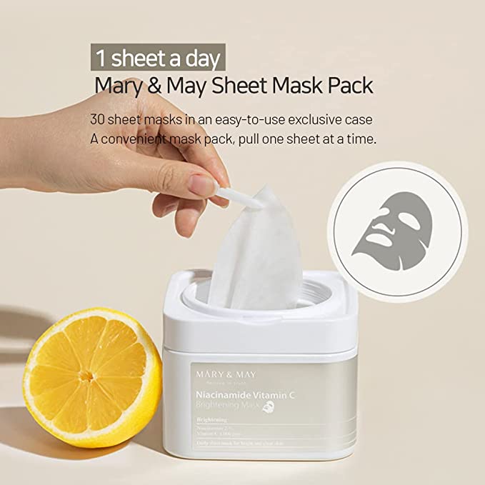Кутия с 30 броя лист маски за лице с ниацинамид и витамин С, които изсветляват кожата. Лесно изваждайте по един лист всеки ден, което го прави удобно, лесно за използване и защитава околната среда чрез намаляване на ненужните отпадъци.Витамин С помага за избледняване на тъмните петна и хиперпигментацията. Основен антиоксидант, който повишава производството на колаген в кожата, избледнява пигментацията и кафявите петна и повишава UV защитата. Съдържа и ниацинамид, който подобрява неравномерния тен на кожата, омекотява, помага в борбата с фините линии и бръчки, стяга порите. Други предимства на ниацинамида са, че помага за обновяване и възстановяване на повърхността на кожата срещу загуба на влага и дехидратация.