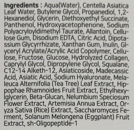 Екстрактът от Centella Asiatica интензивно регенерира, успокоява и укрепва бариерата на кожата, както и възстановява нивото на хидратация на кожата. Растение за заздравяване на рани с противовъзпалителни качества. Намалява умората, хиперпиментацията, дразненето и зачервяванията и повишава нивата на антиоксиданти в кожата.