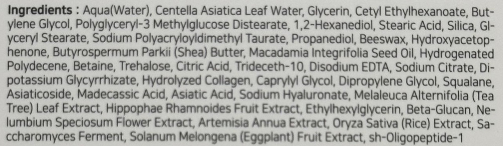 Asiaticoside, активен компонент на Centella asiatica, който ускорява заздравяването на рани, стимулира синтеза на колаген, има силно противовъзпалително и успокояващо действие, което намалява зачервявания и раздразнения. Подобрява хидратацията и укрепва кожната бариера, като същевременно подпомага регенерацията.