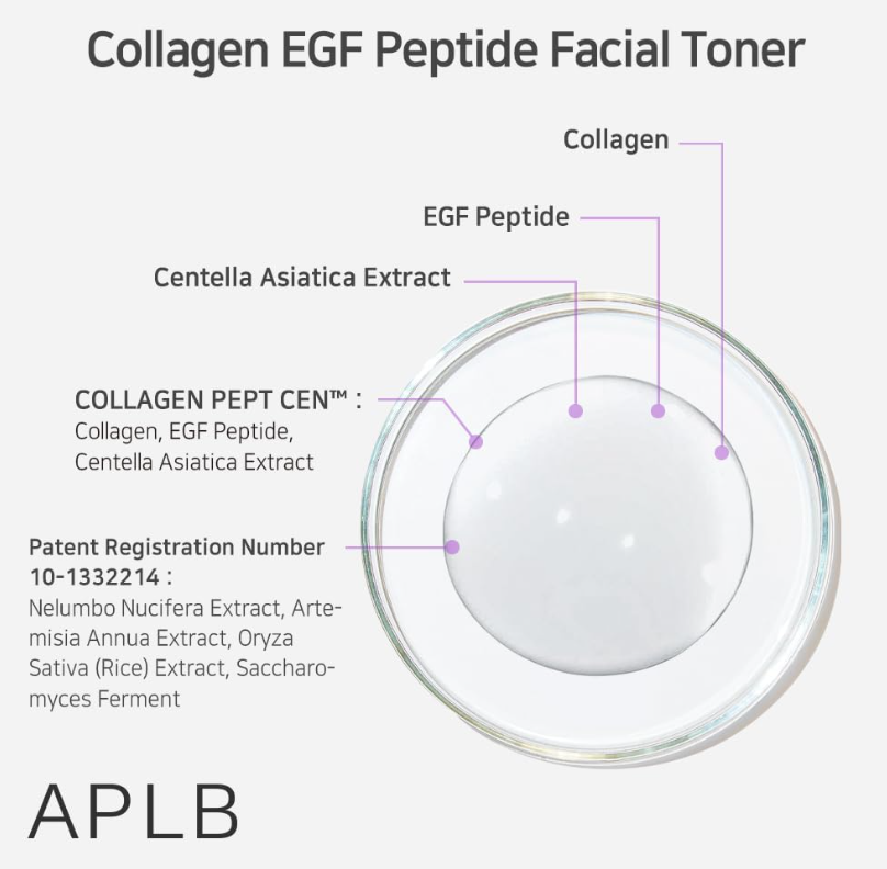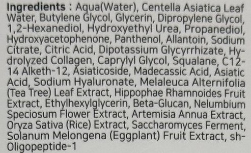 Тонер за лице с комплекс от азиатска центела, колаген и пептиди има лека, освежаваща текстура, която интензивно хидратира и успокоява кожата още при първото нанасяне. Пептидите подпомагат обновяването на клетките и изглаждат фините линии. Комплекса от азиатска центела и нейните активни съединения (азиатикозид, мадекасикова и азиатикова киселина) подпомагат регенерацията на кожата и намаляват зачервяването и раздразнението. Комбинацията от хиалуронова киселина, глицерин и урея осигурява дълбока и продължителна хидратация, като възстановява естествения баланс на влагата. Пантенолът и алантоинът омекотяват и успокояват, докато бета-глюканът и колагенът подсилват бариерната функция на кожата. Екстрактите от чаено дърво, ориз и лотос спомагат за изчистване и озаряване на тена. След нанасяне на тонера, кожата е подготвена за следващите стъпки от вашата рутина.
