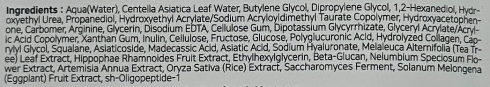 Екстрактът от Centella Asiatica интензивно регенерира, успокоява и укрепва бариерата на кожата, както и възстановява нивото на хидратация на кожата. Растение за заздравяване на рани с противовъзпалителни качества. Намалява умората, хиперпиментацията, дразненето и зачервяванията и повишава нивата на антиоксиданти в кожата.