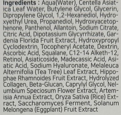 Asiaticoside, активен компонент на Centella asiatica, който ускорява заздравяването на рани, стимулира синтеза на колаген, има силно противовъзпалително и успокояващо действие, което намалява зачервявания и раздразнения. Подобрява хидратацията и укрепва кожната бариера, като същевременно подпомага регенерацията.