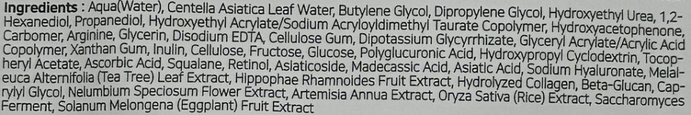 Asiaticoside, активен компонент на Centella asiatica, който ускорява заздравяването на рани, стимулира синтеза на колаген, има силно противовъзпалително и успокояващо действие, което намалява зачервявания и раздразнения. Подобрява хидратацията и укрепва кожната бариера, като същевременно подпомага регенерацията.