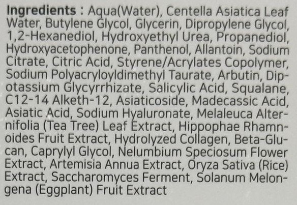 Екстрактът от Centella Asiatica интензивно регенерира, успокоява и укрепва бариерата на кожата, както и възстановява нивото на хидратация на кожата. Растение за заздравяване на рани с противовъзпалителни качества. Намалява умората, хиперпиментацията, дразненето и зачервяванията и повишава нивата на антиоксиданти в кожата.