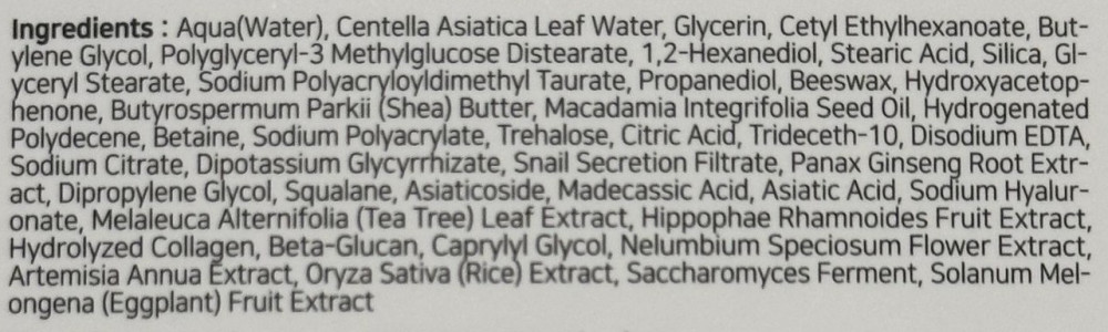 Крем за лице с охлювен муцин и женшен е формулиран като възстановяваща и ревитализираща грижа за кожата, съчетаваща мощни природни екстракти с доказани биоактивни съставки. Филтратът от секрет на охлюв (Snail Secretion Filtrate) е източник на естествени пептиди, гликолова киселина и еластин, които подпомагат регенерацията, изглаждат текстурата и подобряват еластичността на кожата. Екстрактът от корен на женшен (Panax Ginseng) стимулира микроциркулацията и придава жизненост, като същевременно подобрява тонуса и устойчивостта на кожата. Centella Asiatica Leaf Water и нейните активни компоненти – азиатикова, мадекасова киселина и азиатикозид – подпомагат възстановяването и успокояват раздразненията. Хидролизираният колаген и хиалуроновата киселина хидратират в дълбочина и укрепват дермалната структура, като правят кожата по-гладка и стегната. Скваланът, маслата от ший и макадамия подхранват и възстановяват липидния баланс, придавайки кадифена мекота. Бета-глюканът и ферментиралите растителни екстракти засилват защитните механизми и подпомагат равномерния тен. Формулата е балансирана и нежна, подходяща за всички типове кожа, включително чувствителна. При редовна употреба кожата изглежда по-гладка, по-плътна и видимо подмладена — сияйна, еластична и изпълнена с жизненост.