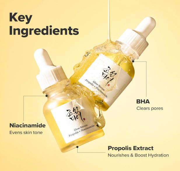 Серум за лице с прополис и ниацинамид. Обогатен е с екстракт от прополис (60%) и ниацинамид (2%), инхибира прекомерното натрупване на меланин в увредените зони на кожата, като по този начин осигурява равномерен тен. Медната текстура на серума не оставя лепкавост, спомага за задържането на влага в кожата на лицето и хидратира.