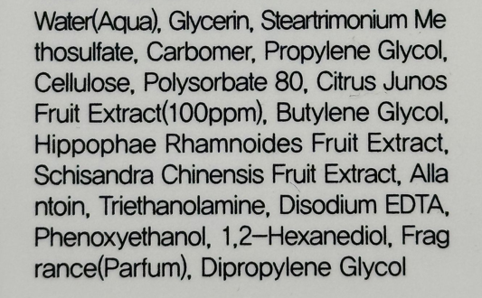 Пилинг гел за лице с юджа и морски зърнастец ефективно премахва мъртвите клетки и замърсяванията от повърхността на кожата, без да причинява сухота или дразнене. Формулата съдържа екстракт от юджа (Citrus Junos Fruit Extract, 100 ppm) – богат на естествени органични киселини и витамин C, които изсветляват тена и придават здравословно сияние. Добавеният екстракт от морски зърнастец (Hippophae Rhamnoides Fruit Extract) подхранва кожата с антиоксиданти и подпомага регенерацията, докато екстрактът от Schisandra Chinensis укрепва кожната бариера и подобрява нейната еластичност. Алантоинът успокоява и омекотява кожата след ексфолиране. Благодарение на нежната формула с целулозни частици, пилинг гелът механично отстранява натрупаните мъртви клетки, като разкрива по-гладка, чиста и свежа кожа. Триетаноламинът регулира pH баланса, за да поддържа естествената физиология на кожата, а растителните екстракти осигуряват антиоксидантна защита.