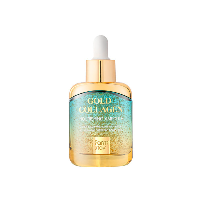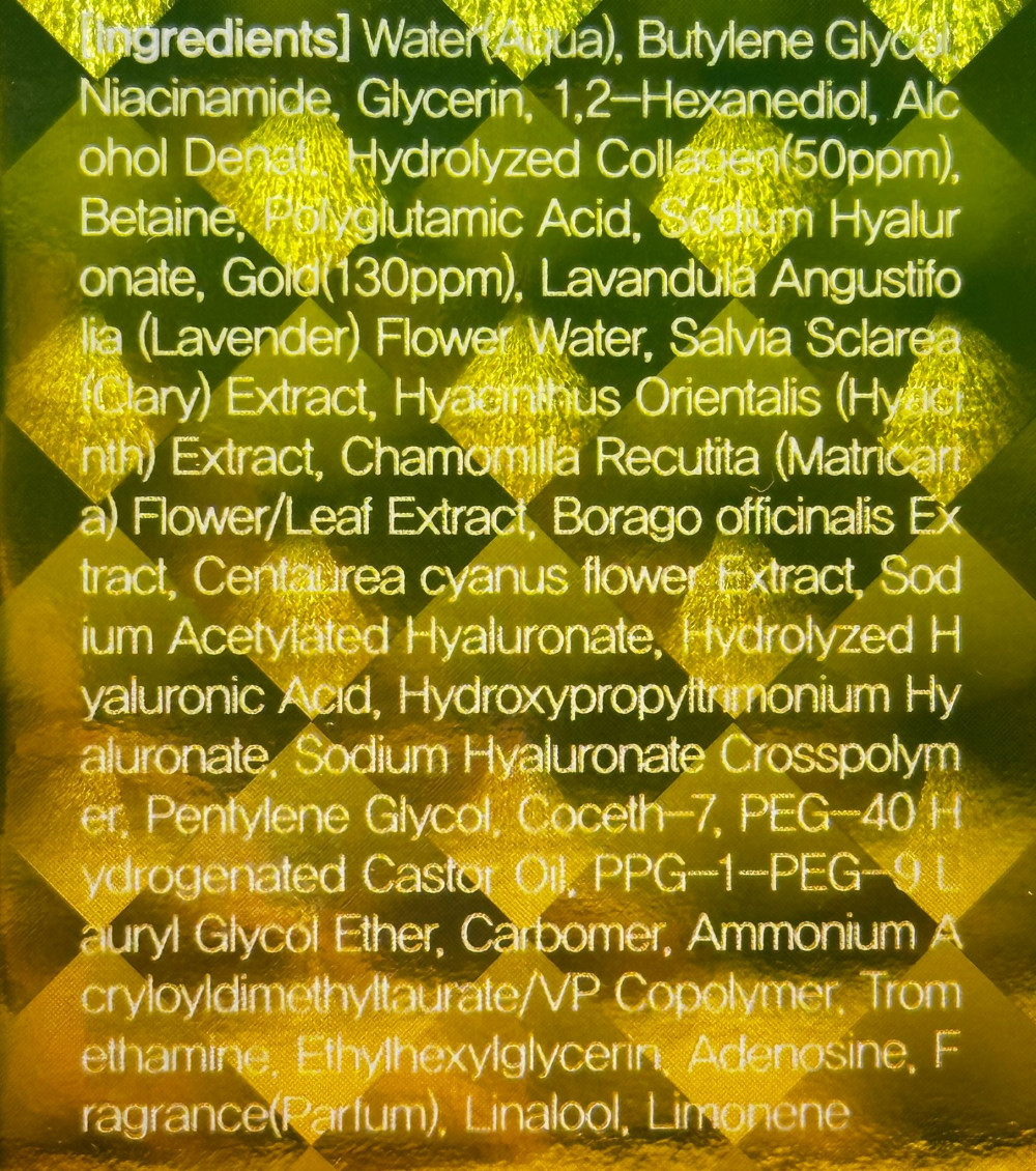Ампулата с колаген и златни частици комбинира ниацинамид и хиалуронова киселина за изравняване на тена и интензивна хидратация. Формулата с хидролизиран колаген и аденозин подпомага еластичността и изглажда фините линии. Бетаинът и растителните екстракти от лавандула, лайка и метличина успокояват и защитават кожата. Обогатена със златни частици, ампулата придава сияен и свеж вид. Формулата не съдържа парабени и сулфати.