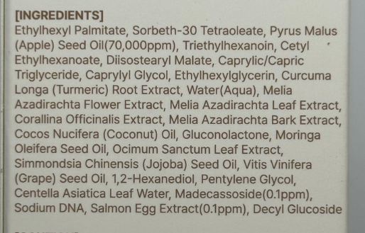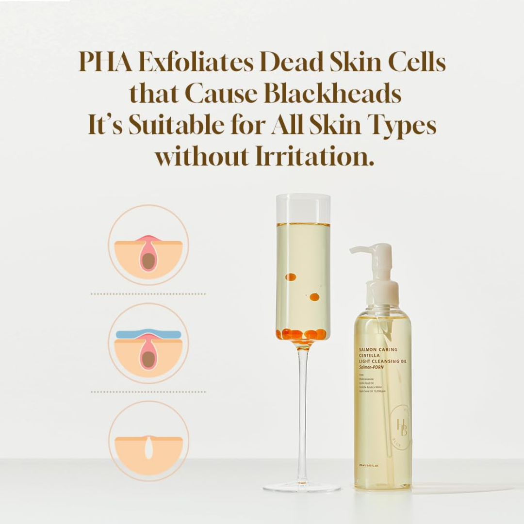 Почистващо олио за лице с екстракт от хайвер на сьомга и азиатска центела, комбинира високоефективни емолиенти с биологично активни молекули за дълбоко, но щадящо почистване. Формулата разтваря водоустойчив грим, излишен себум и замърсявания, без да нарушава естествената кожна бариера. Включеният PDRN (Polydeoxyribonucleotide) подпомага поддържането на оптималните процеси на клетъчно обновяване. Той е източник на нуклеотиди, които естествено участват в регенеративните механизми на кожата. Екстрактът от хайвер на сьомга доставя протеини, аминокиселини и микроелементи с доказани антиоксидантни свойства. Тези компоненти подпомагат защитата от оксидативен стрес и поддържат жизнения вид на кожата. Растителните масла в състава, като ябълково, жожоба и гроздово, подпомагат хидратацията и омекотяването. Екстрактите от куркума и нийм са богати на фитохимикали, които допринасят за антиоксидантната защита. Добавеният мадекасозид е добре изследван за своя успокояващ ефект върху кожата. Глюконолактона е полихидрокси киселина, която осигурява нежно обновяване и задържане на влагата. Формулата се емулгира лесно благодарение на нежни повърхностноактивни съставки. Резултатът е чиста, гладка и комфортна кожа след всяко измиване.