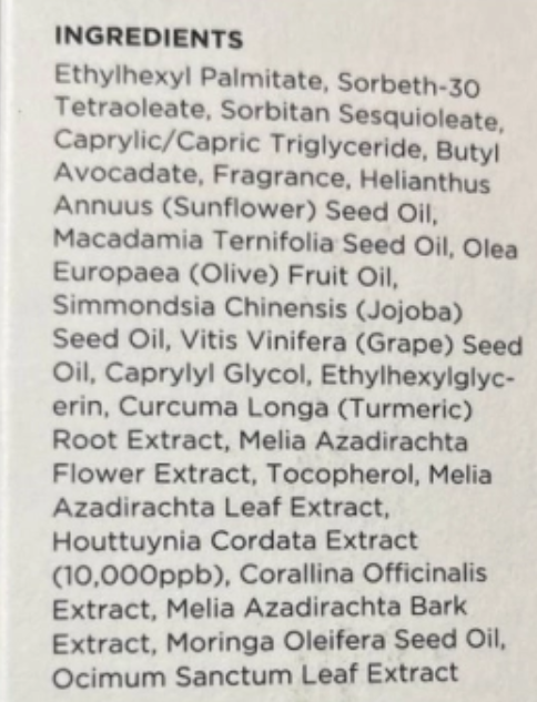Основната съставка е Хутиния , чиято забележителна характеристика е противовъзпалителната мощност, богата е на антиоксидантии има успокояващ и освежаващ ефект. Екстрактът от това растение дълбоко почиства кожата, без да я дразни и леко я ексфолира, за да подобри нейната тектура. Формулата на продукта е некомедогенна, което означава че е подходяща за чувствителна кожа, склонна към несъвършенства. Съдържанието на масло от семена на макадамия стимулира производството на кератин, който е нужен за здрава и защитена кожа.