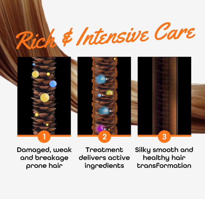Маска за коса с масла и хидролизирана коприна (3000ppm), хидролизиран еластин, хидролизиран кератин. и други нискомолекулни протеини, които помагат за възстановяването на косата отвътре и отвън.