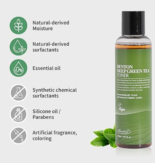 Тонерът е формулиран с над 53% вода от листа на зелен чай и комплекс от зелен чай от Boseong, Корея, който помага за успокояване на раздразнената кожа, като същевременно възстановява баланса на кожата. Леко киселинната формула е подходяща за всички типове кожа, включително чувствителна. Прозрачната водниста текстура позволява бързо и цялостно попиване от кожата без лепкавост.