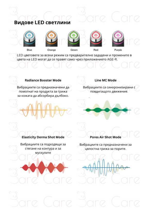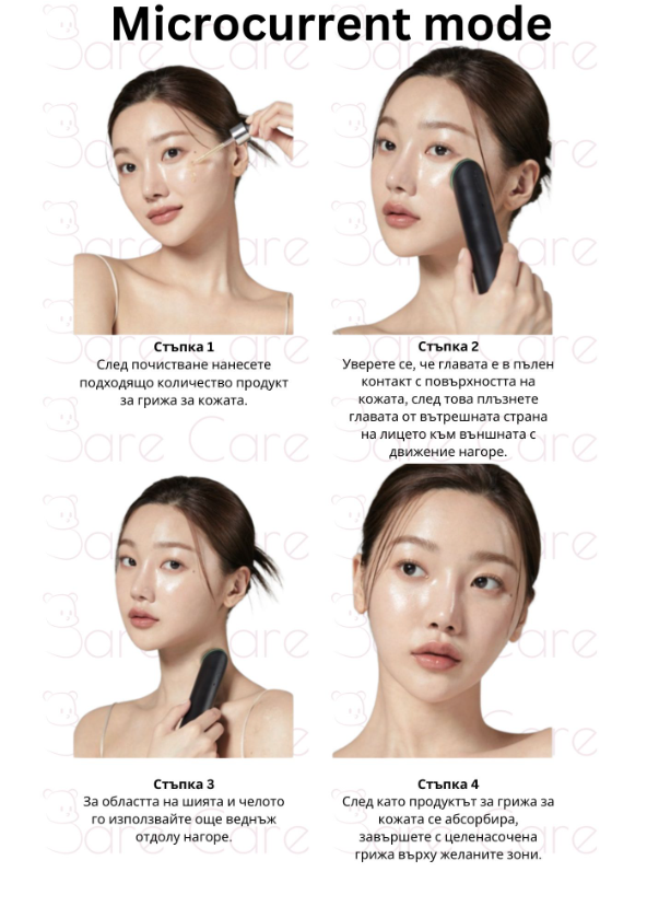 Предлага различни вибрации, включително вибрация за повече блясък, вибрация за изглаждане на фини линии, вибрация за контура на лицето и вибрация за свиване на порите.