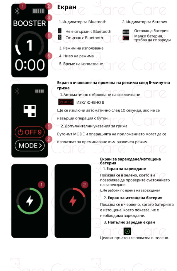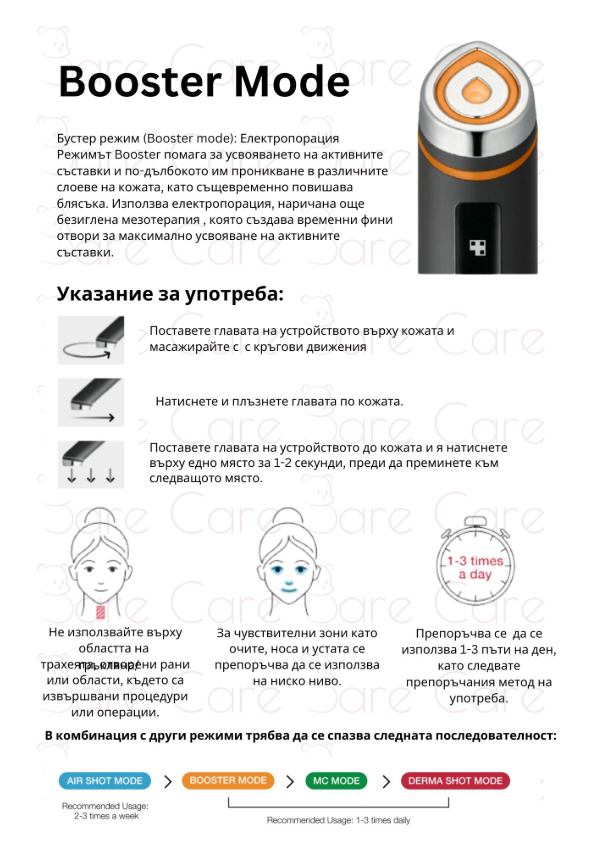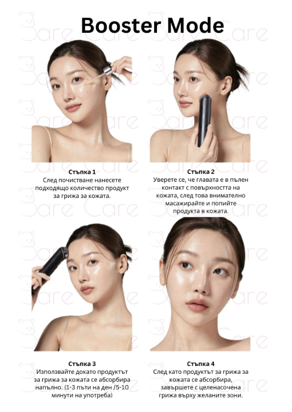 Режимът Booster помага за усвояването на активните съставки и по-дълбокото им проникване в различните слоеве на кожата, като същевременно повишава блясъка. Използва електропорация, наричана още безиглена мезотерапия , която създава временни фини отвори за максимално усвояване на активните съставки.