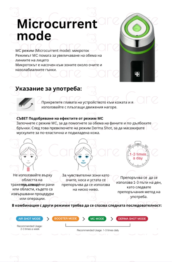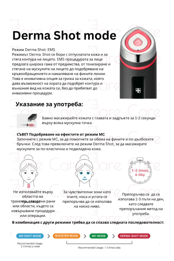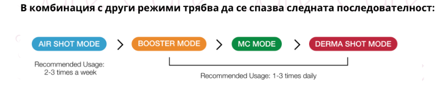 - Да, четири режима могат да се използват едновременно. След като използвате режима air shot на суха кожа, използвайте режимите бустер, микроток и дерма шот заедно с грижата за кожата, която използвате обикновено.