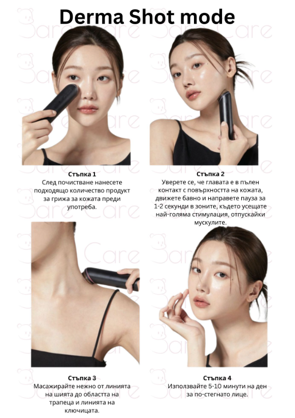 Режимът Derma Shot се бори с отпуснатата кожа и за стяга контура на лицето. EMS процедурата за лице предлага широка гама от предимства, от тонизиране и стягане на мускулите на лицето до подобряване на кръвообращението и намаляване на фините линии. Това е иновативна опция за грижа за кожата, която дава възможност на хората да подобрят контура и външния вид на кожата си, без да прибягват до инвазивни процедури.